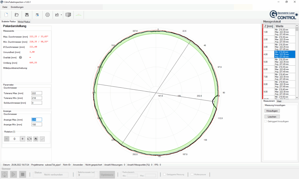 - Måleprinsipp: Sirkulær lasertriangulering / sirkulært lys snitt